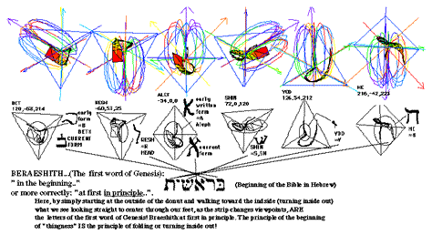 Imagen: BEREASHIT (la primer palabra en el Génesis) "en el principio" o más correctamente "primero en el principio". Aquí, empezando desde el exterior de la dona y caminando hacia el interior (girándonos de dentro hacia fuera) lo que vemos si miramos justo al centro desde nuestros pies, cuando la cuerda cambia los puntos de vista, SON las letras de la primera palabra del Génesis¡ BEREASHIT: Primero en el principio. El comienzo del principio de la "cosificación" ES el principio del doblamiento o del giro de dentro hacia fuera.