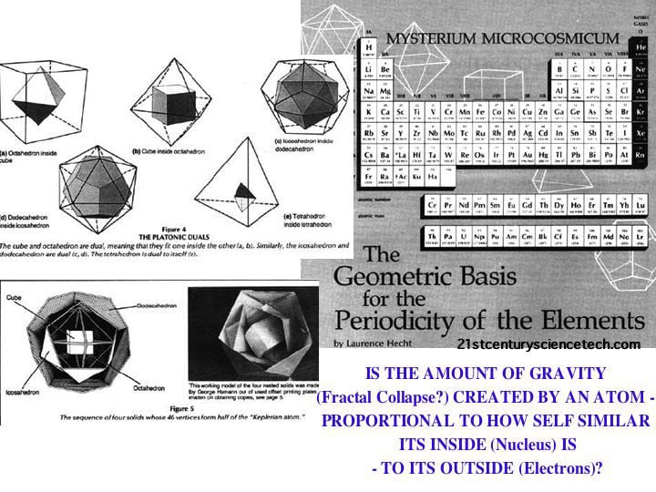(repeating above paragraph) In (this) my earlier publication "Fractality: The Physics of Creation" goldenmean.info/creation - I visually illustrated HOW fractality is the cause of the gravitational force that holds the atom together. Specifically - that the (platonic nest ) geometry of the placement of the hadrons (protons/neutrons) in the nucleus is precisely SELF SIMILAR or fractal to the (platonic nest ) arrangement of the electron shells -inside -out so to speak. This fractality (where charge compression is turned in to charge acceleration by constructive heterodyning b PHI of phase velocities) then allows the non-destructive charge collapse - called gravity- which then holds both atoms and galaxies together.