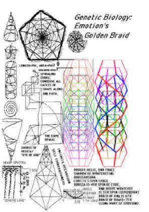 (Izq) Biología Genética: la trenza dorada de la emoción; (abajo) doble hélice, la sombra del trazo del ADN de un dodecaedro “enroscado”. El cubo es 3 giros en el espacio, el dodecaedro es el cuarto giro del cubo, el “enroscado” ADN dodecaedrico es el 5to giro (dimensión) la trenza del ADN es el 6to, la trenza de la trenza = 7mo (la onda larga de la emoción).