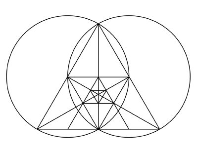 A partir de la vesica piscis dibuja las líneas vertical y horizontal. Con el compás apoyado en el centro del cruce de ambas líneas y radio al centro de los círculos grandes traza el ciruclo pequeño. Conecta los cuatro puntos del trazo y fractaliza el dibujo uniendo los puntos medios de cada línea.