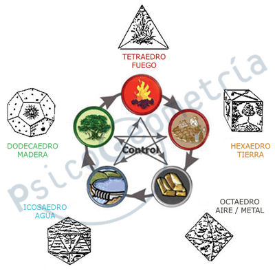 Son sólo 5 sólidos pues ninguna otra figura geométrica cumple con las condiciones descritas anteriormente. Son nombrados tetraedro (4 triángulos), hexaedro (6 hexágonos), octaedro (8 triángulos), icosaedro (20 triángulos) y dodecaedro (12 pentágonos). Cada uno de estos sólidos está asociado a diferentes cualidades de la energía/materia y están descritos por los cinco elementos conocidos desde la antigüedad y recuperados por todas las tradiciones: fuego, tierra, aire o metal, agua y éter o madera, respectivamente.