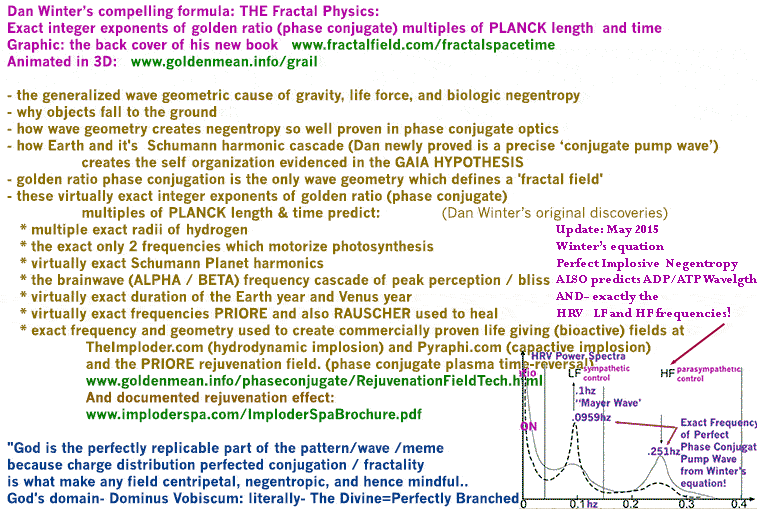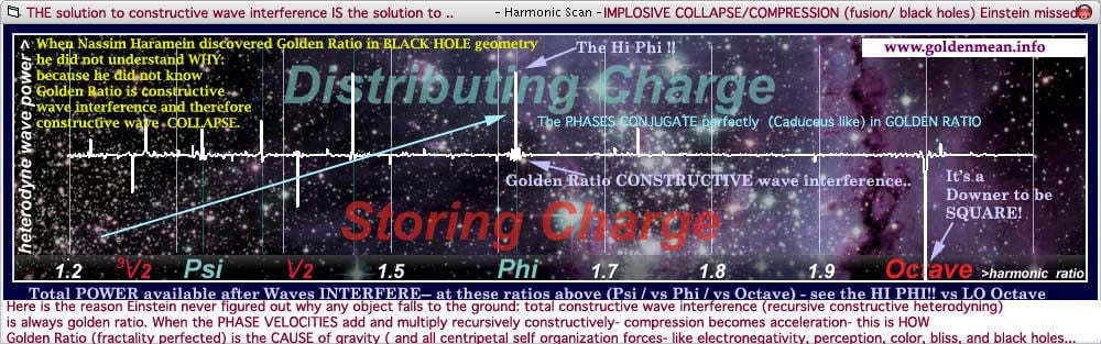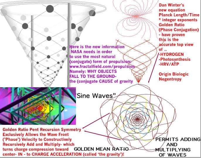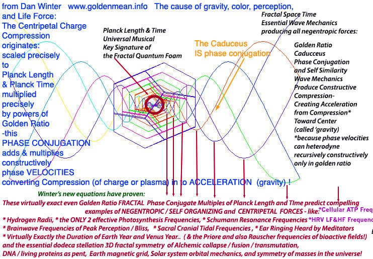 Dan Winter: "Golden Ratio Phase Conjugation causes gravity by uniquely allowing phase velocity heterodynes- to add and multiply recursively constructively- turning (phase conjugate golden ratio) charge compression IN to acceleration of charge toward center.. called THE GRAVITY.