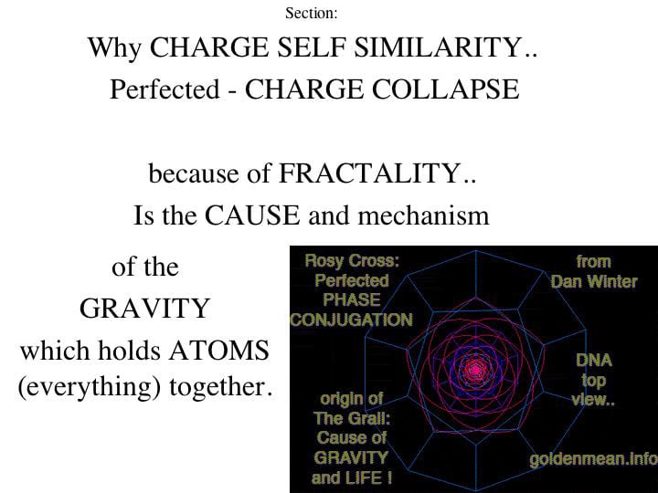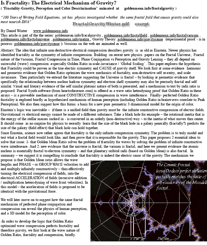 Implosion Group (originally by Dan Winter)newsletter Mar 11, 07 Fractal Gravity-Completing the PROOF that FRACTALITY IS the Electrical CAUSE of the Gravity: url: goldenmean.info/fractalgravity