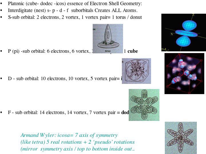 Visually showing how self- similar/ fractal (golden ratio / conjugate) charge collapse creates the atomic table- is illustrated by the fractal relation of electron shell symmetries to the nucleus. Specifically- we see that all electron shell symmetry (s,p,d,f sub-orbitals)- is essential S- TOROIDAL, P-TETRA/CUBIC, and D-F being dodec/icos: