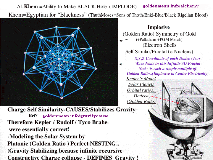 Proving my hypothesis that fractality is the cause of gravity would complete the stated dream of both Einstein and Kepler. Einstein was convinced that infinite charge collapse or compression was the key to unifying the electric field with gravity. Of course he could not have known that fractality is clearly physics only answer to infinite compression. Kepler kept dreaming that the planetary orbitals were a dance around the platonic solids. What he did not know - was that the platonic solids primary nesting ratios always involve primarily Golden Ratio (tetra cube to dodec to icos ratio to dodec )- in counterpoint to the square root of 2 ratios inside the tetra cube octa. I have shown that in the infinite stellated (5cube)-dodec to icos to dodec (all the above animations + the essential symmetry of Diseño Natural Armónico, Earth Grid, Zodiac, Universe + Every Living Protein, Cold Fusion, Gravity + Consciousness + ONLY possible true 3D Fractal ) - EACH one of the infinite array of vertex has x,y,and z coordinates which are a simple multiple of Golden Ratio! (My first book "One Crystals Dance").