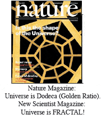 "Is the universe a dodecahedron? (ref: ) , 8 October 2003-NATURE MAGAZINE:"The standard model of cosmology predicts that the universe is infinite and flat. However, cosmologists in France and the US are now suggesting that space could be finite and shaped like a dodecahedron instead. They claim that a universe with the same shape as the twelve-sided polygon can explain measurements of the cosmic microwave background - the radiation left over from the big bang - that spaces with more mundane shapes cannot (J-P Luminet et al. 2003 Nature 425 593)."