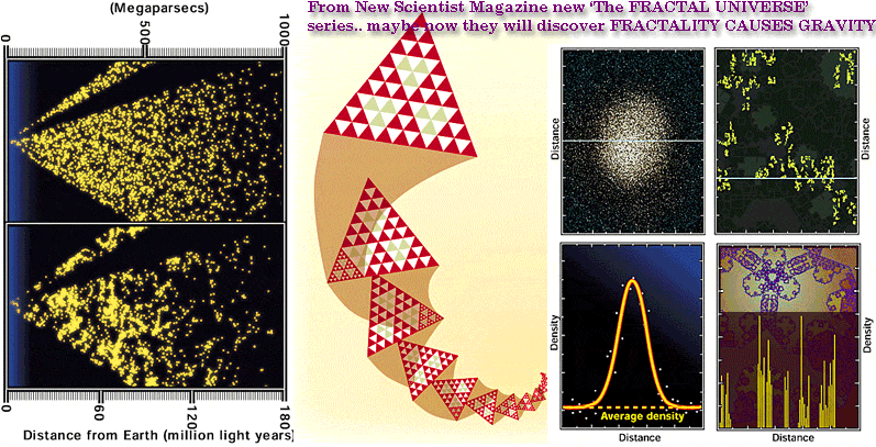 Relegates the idea of the Higgs Boson- and Dark Matter- to the dustbin of history. If it is well known that the arrangement of masses in the Universe- is fractal / dodeca (see the cover of New Scientist and Scientific American Magazines-below)- AND the new theory from Dan Winter - that (dodeca/golden ratio ) charge fractality/phase conjugation- causes gravity- THEN it is strongly suggested that the extra gravity physicists use as the only excuse to imagine the totally un-proven idea of dark matter- could well now be explained by the new FRACTAL THEORY OF GRAVITY- from Winter.