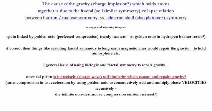 (repeating above paragraph) In (this) my earlier publication "Fractality: The Physics of Creation" goldenmean.info/creation - I visually illustrated HOW fractality is the cause of the gravitational force that holds the atom together. Specifically - that the (platonic nest ) geometry of the placement of the hadrons (protons/neutrons) in the nucleus is precisely SELF SIMILAR or fractal to the (platonic nest ) arrangement of the electron shells -inside -out so to speak. This fractality (where charge compression is turned in to charge acceleration by constructive heterodyning b PHI of phase velocities) then allows the non-destructive charge collapse - called gravity- which then holds both atoms and galaxies together.