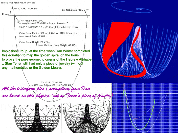 These are equation animations of"Phi Recursion physics" , ceated by Dan Winter..from his simple equation FOR PERFECTED phase conjugation. He used the Golden Mean spiral mapped into 3D either on the (60 degree) Cone of concentric Dodec, and also that same Golden Spiral - topo mapped on the torus shape of all fields (origin of alphabets)