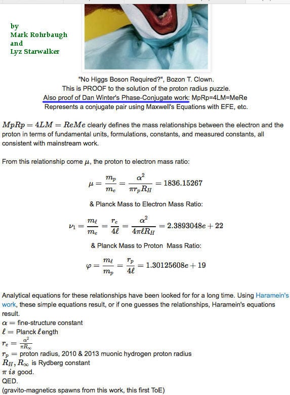 What Mark & Lyz prove (below) by their new equation for the (phase conjugate)geometric ratio of proton to electron mass - is that the reason proton's exist is because they are embedded in a phase conjugate arc from the electron! .. also proving Dan Winter's phase conjugate model of gravity.